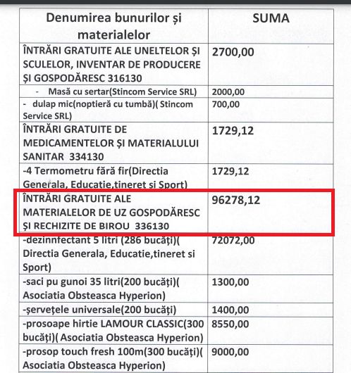 Suma de peste 96 mii lei constituie jumătate din bugetul preconizat pentru materialele de uz gospodăresc și a rechizitelor de birou cheltuit pentru anul 2021 de către Liceul „Hyperion”, deci se creează riscuri ca cheltuielile din bugetul preconizat să se suprapună cu cele din donații.