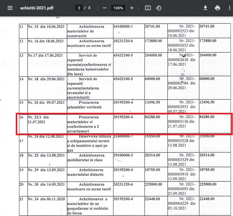 - 2 acvariumuri achiziționate la prețul de 84280 lei;